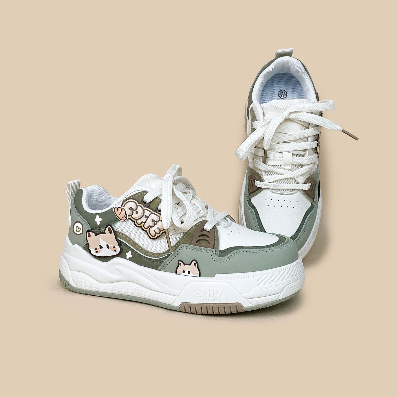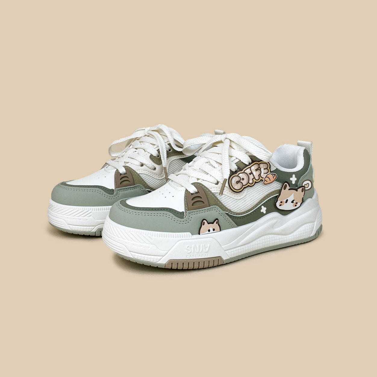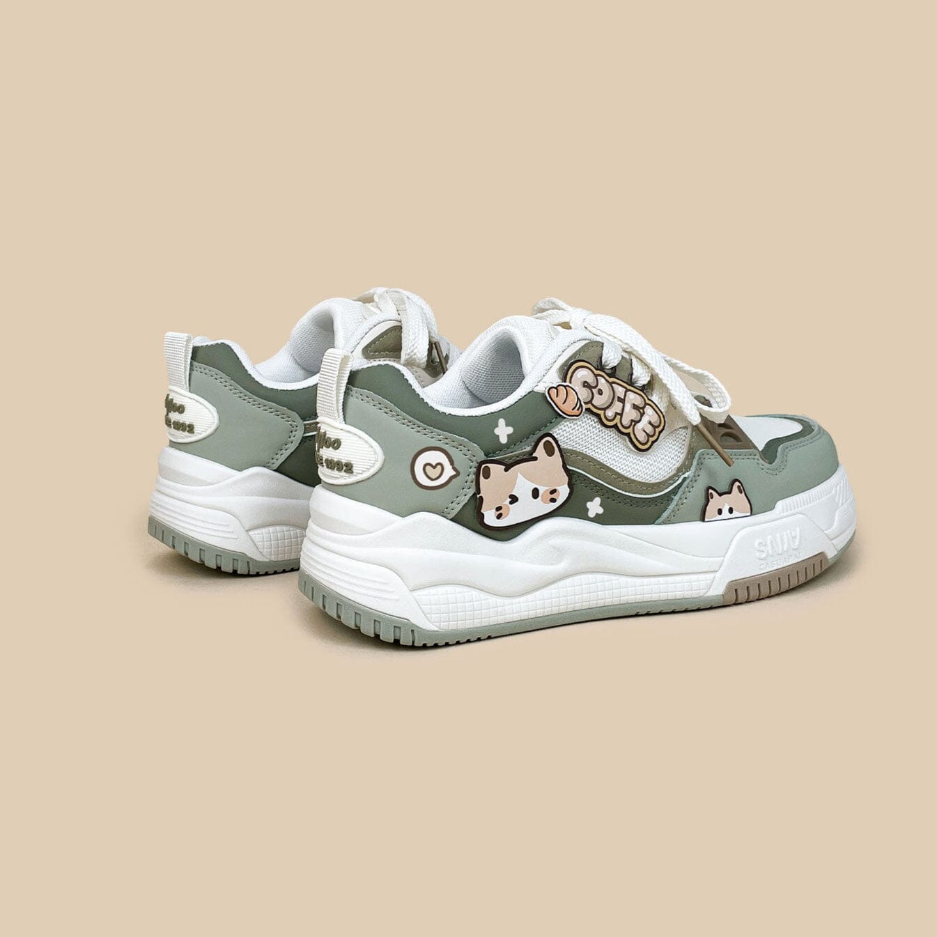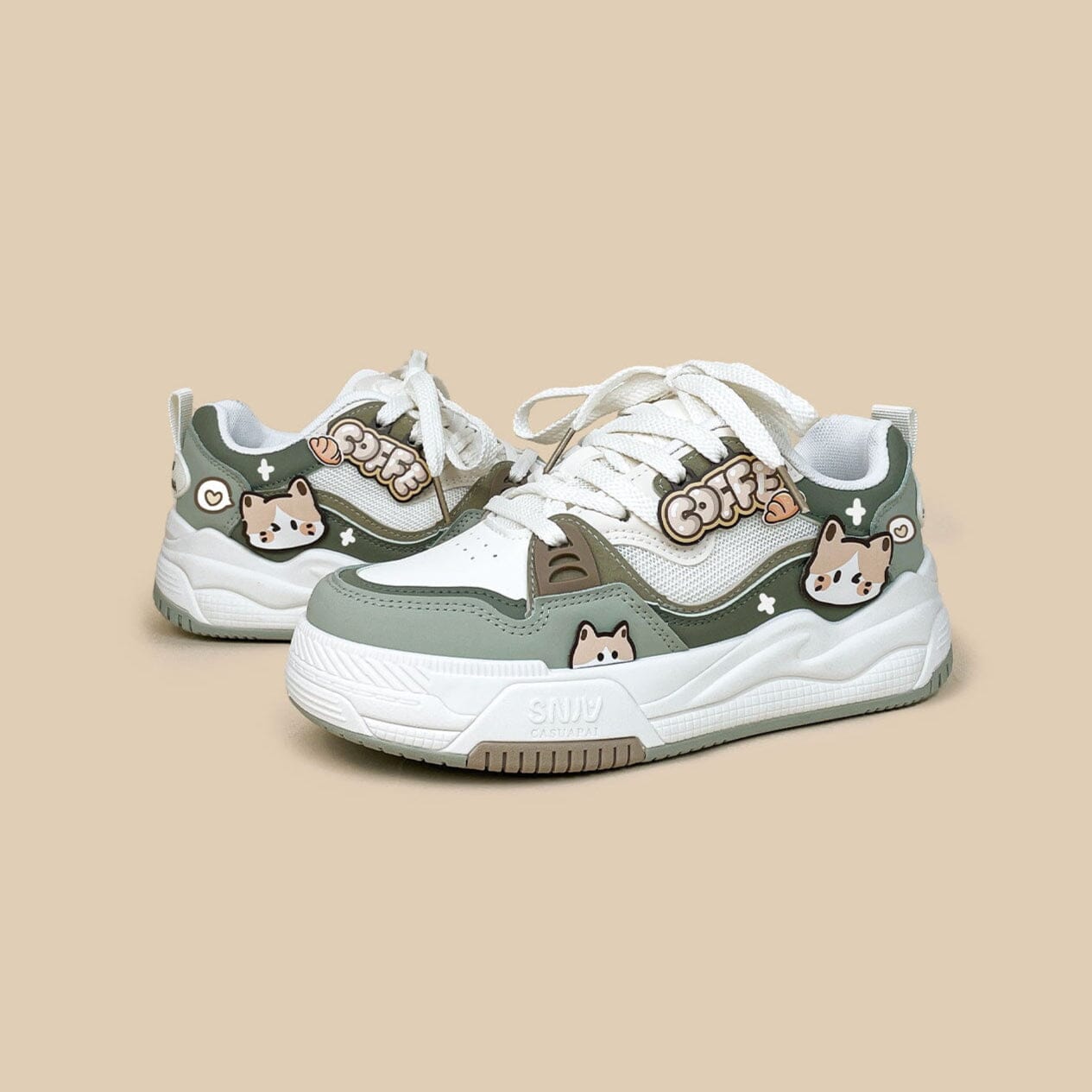 • Your daily dose of cozy, now in a sneaker form! Meet the Matcha Mocha Kitty Cafe Green Shoes, our dreamy blend of soft cream and sage green inspired by your favorite green drink.