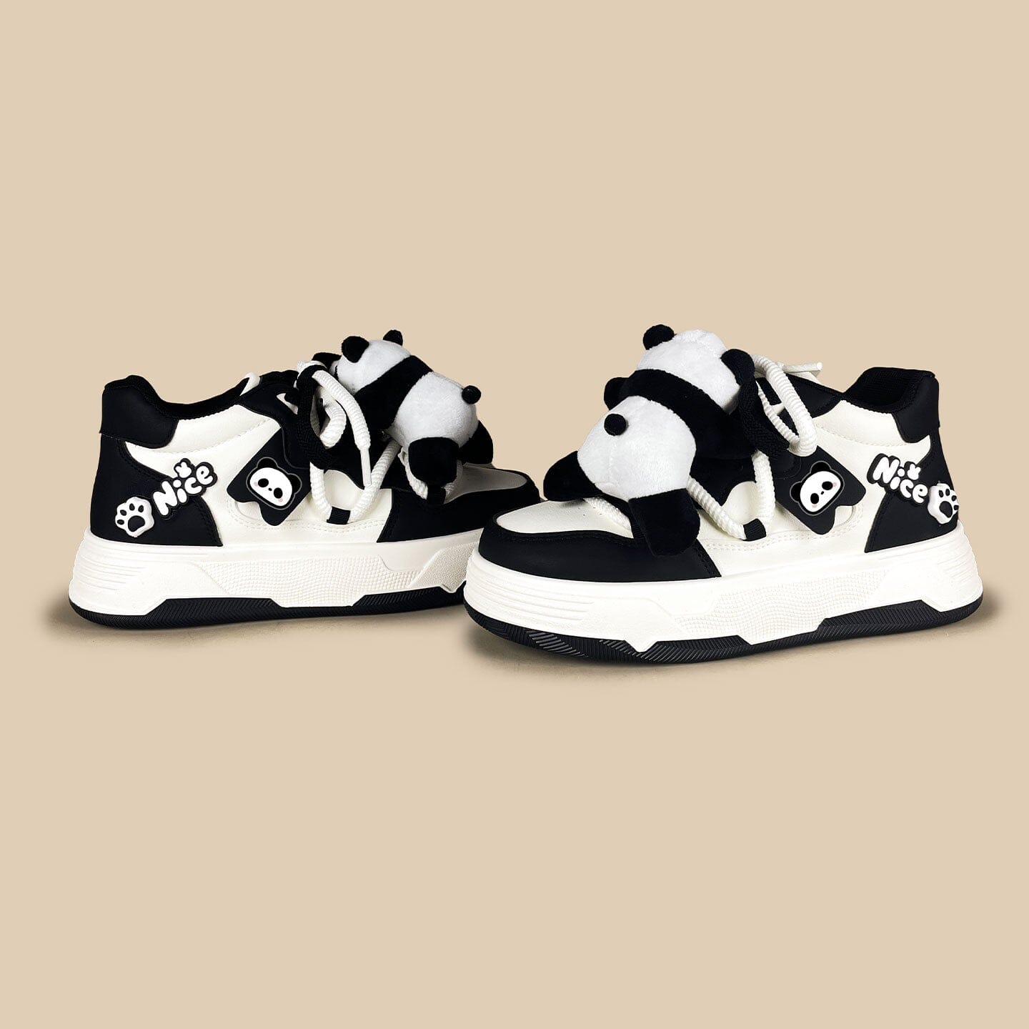 - Designed with contrasting monochrome panels and finished with an adorable removable plush panda wrapped around the laces, this pair blends kawaii collectibility with street-style edge. A matching panda charm and playful “Nice” detail complete the look, making every step feel a little more fun.