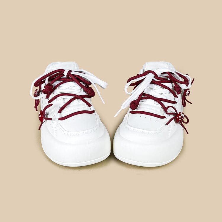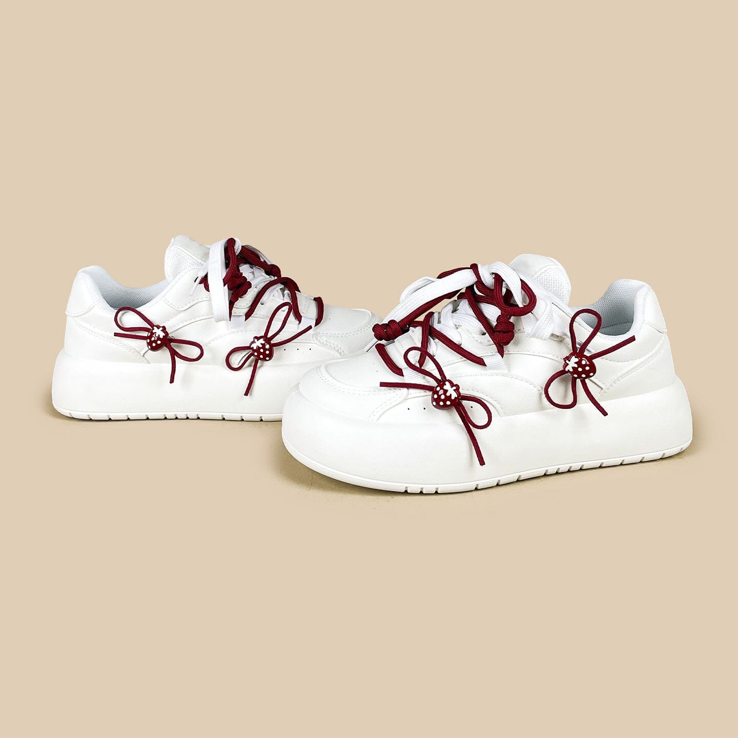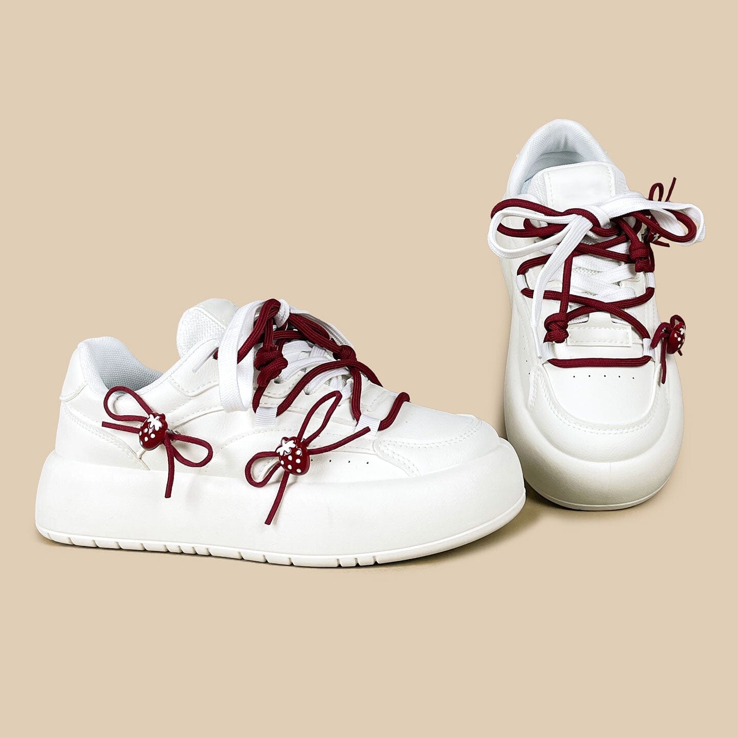 • Designed with deep berry-toned laces, delicate bow details, and tiny strawberry charms, this pair blends nostalgic kawaii accents with everyday comfort.