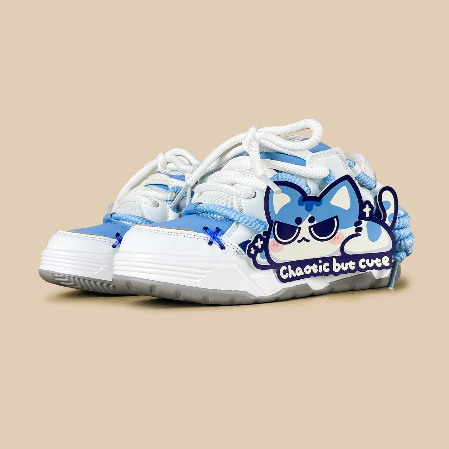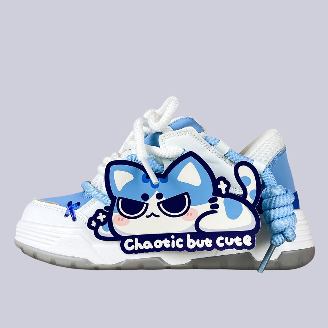 - Designed with soft sky-blue accents and decorated with an oversized mischievous cat charm featuring the iconic “Chaotic but Cute” tag, this pair captures that perfectly unhinged-but-adorable vibe. The layered blue laces and chunky silhouette give it personality, while the expressive kitty face makes sure your shoes do all the talking.