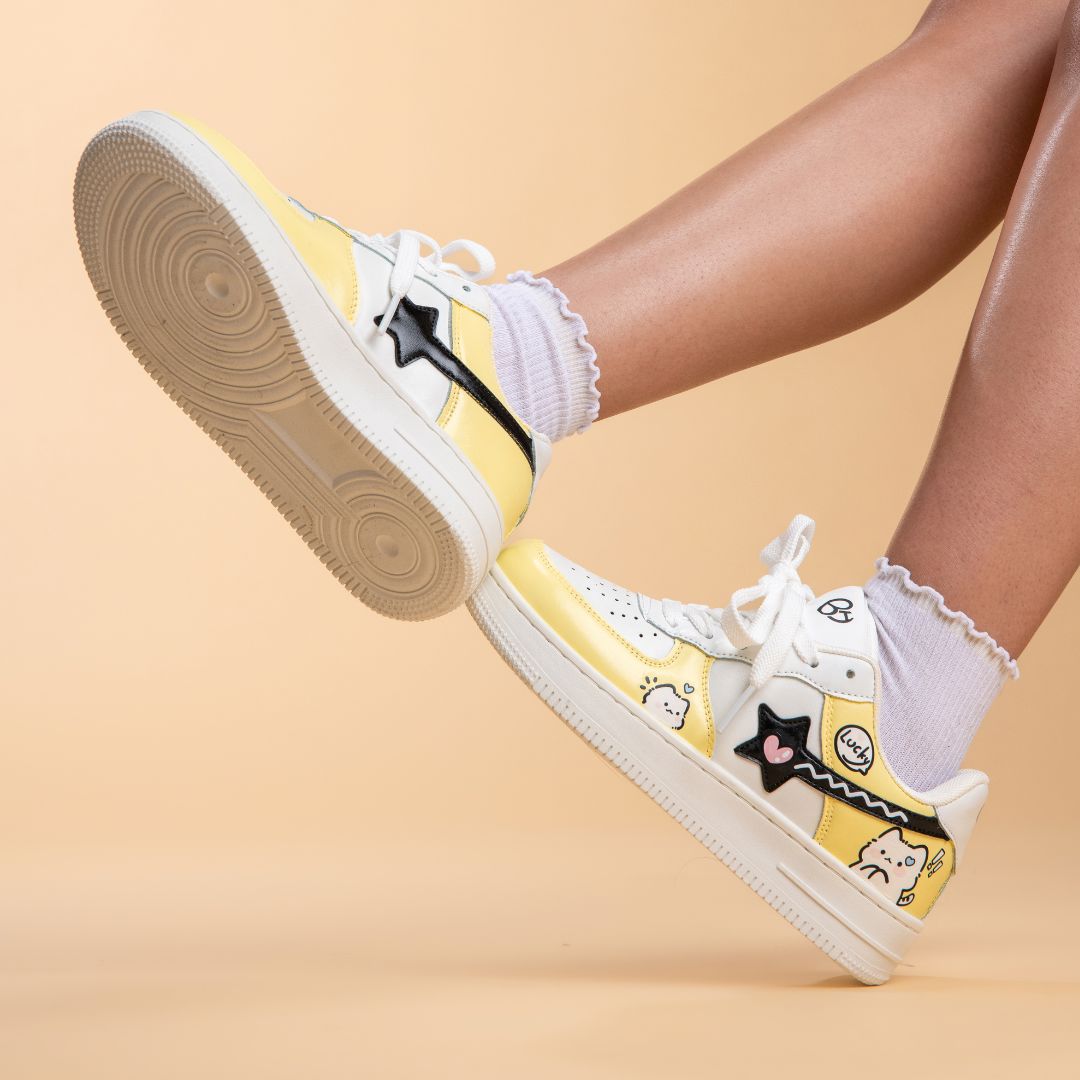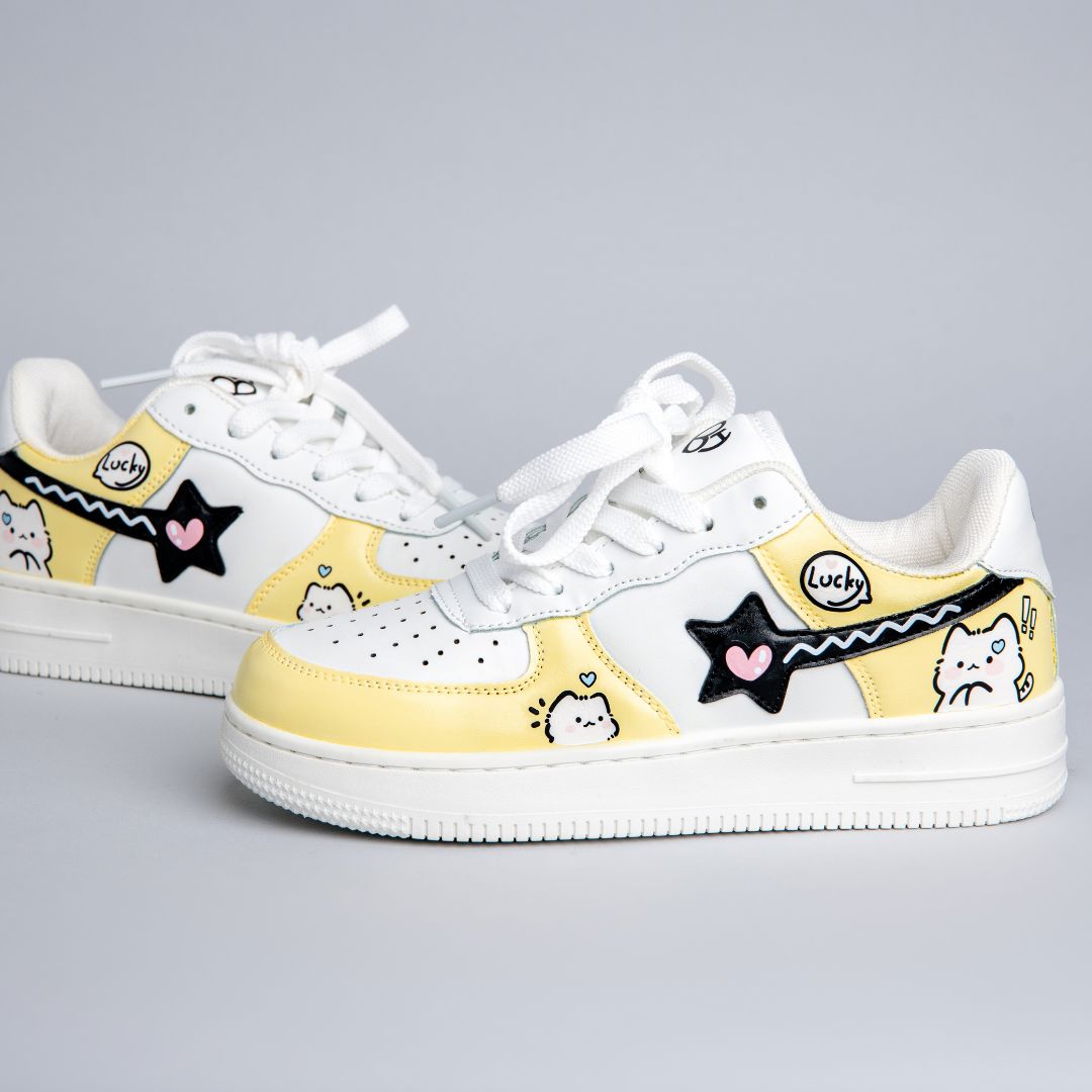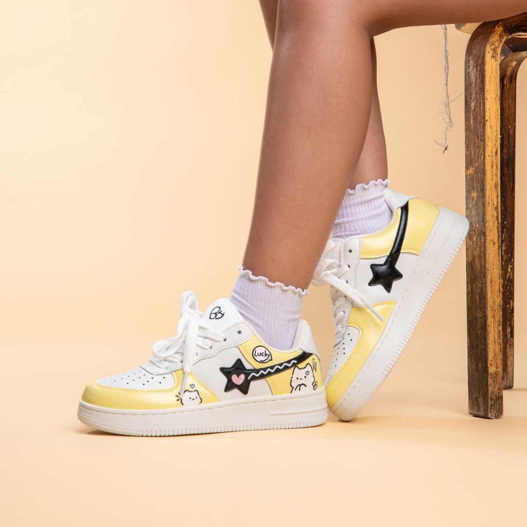 Hand Painted Lucky Cat Butter Yellow Sneakers - Unisex Cat Bobo's House