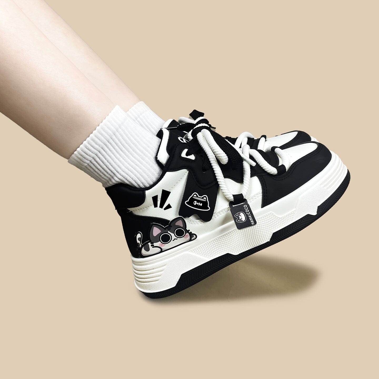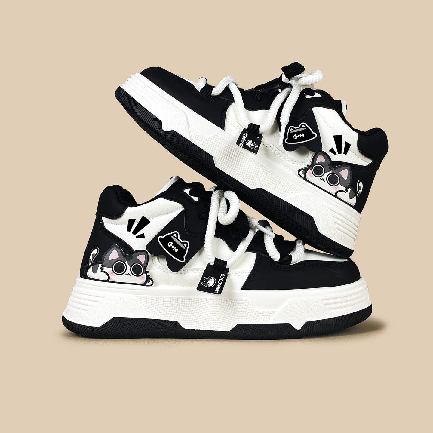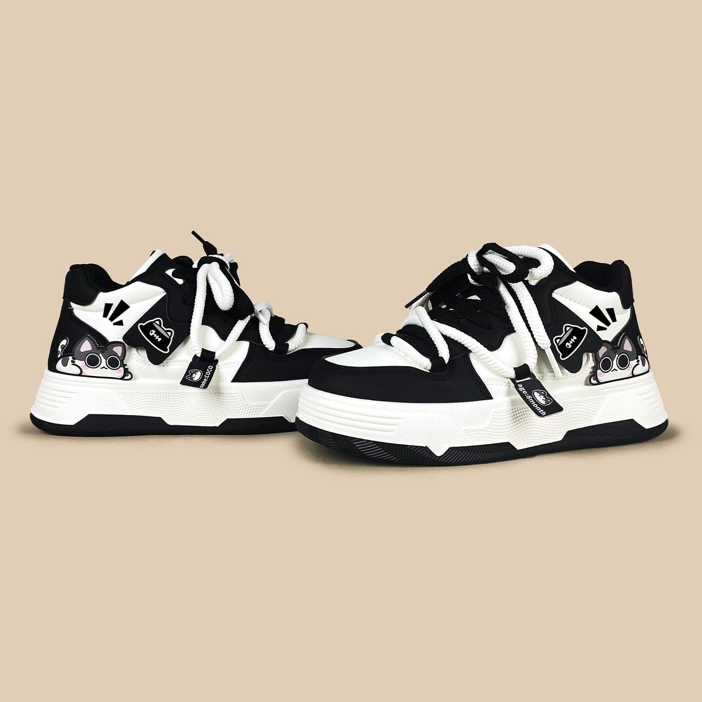 - Featuring a clean cream base layered with deep black overlays and a peeking kawaii cat decal, these mid tops add the perfect touch of contrast to casual looks while staying wearable enough for everyday adventures.