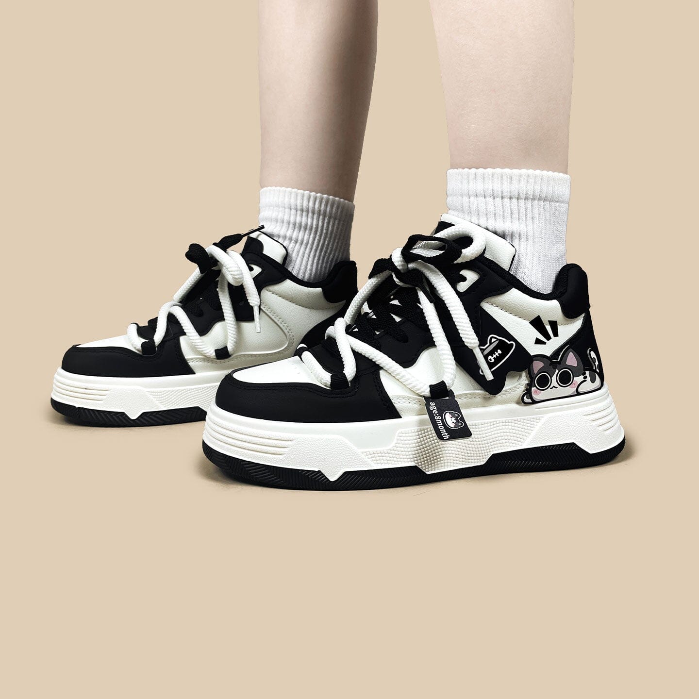 - Designed with everyday black and cream contrasting colors, oversized white laces, and an adorable mini kitty tag (because 8 months old and already stealing hearts), this pair delivers personality in every step without sacrificing comfort.
