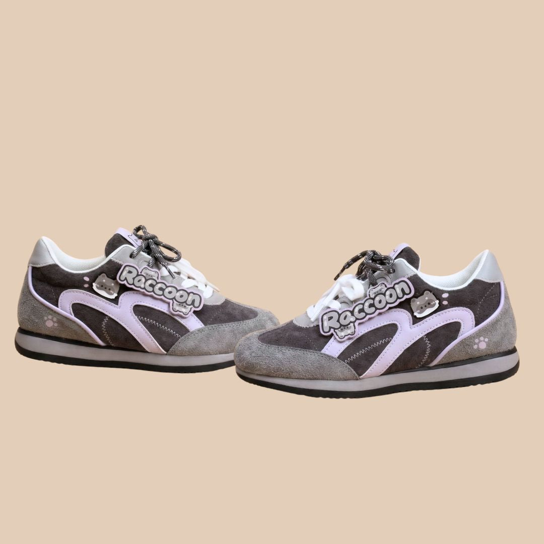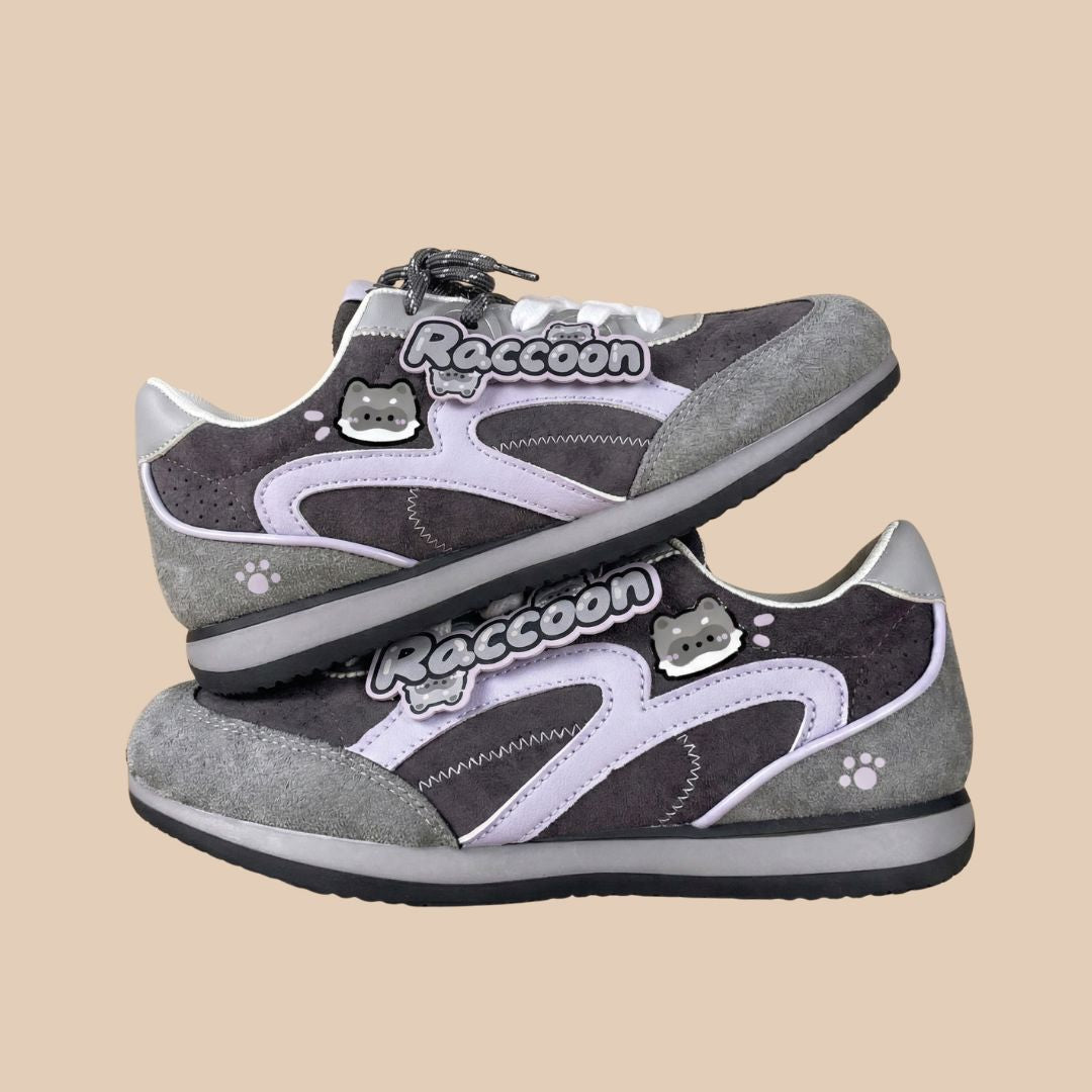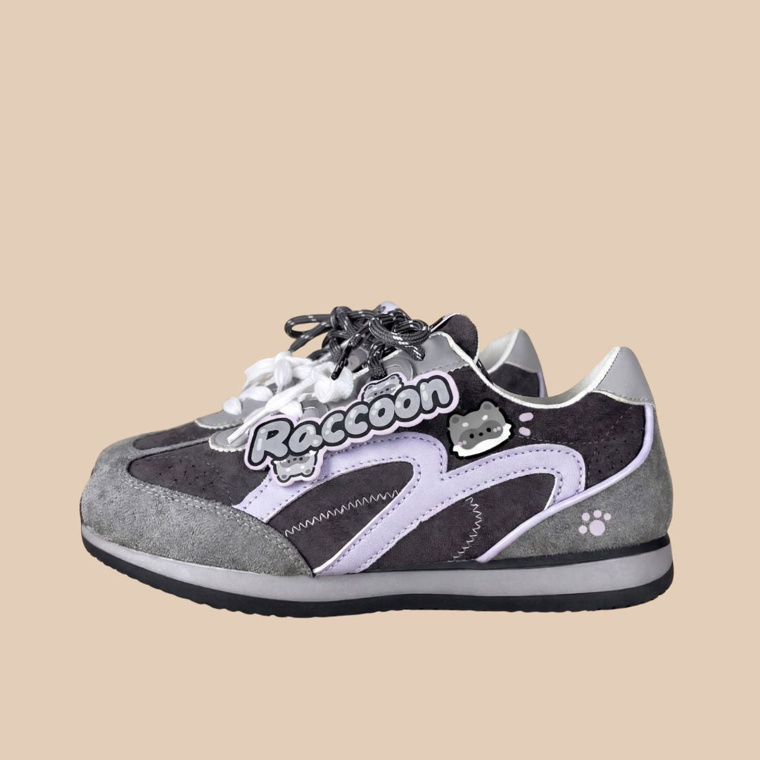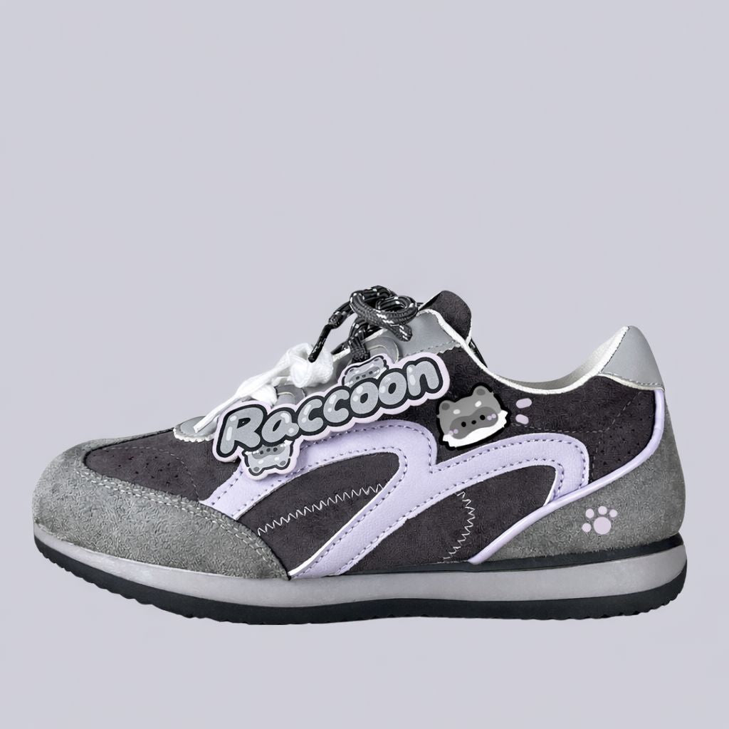 Meet our Raccoon Suede Retro Runner Sneakers, a playful design inspired by nighttime adventures, soft woodland tones, and vintage trainers with personality. - Designed with plush suede panels in charcoal and grey and finished with adorable raccoon graphics and a collectible “Raccoon” lace tag, this pair blends classic retro sneaker style with the mischievous charm of everyone’s favorite little bandit. The cool grey palette paired with soft lavender accents gives these sneakers a unique look that’s playful yet easy to style.